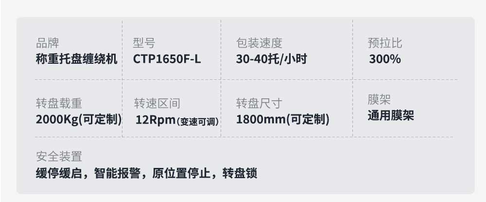 大宏佳(jiā)森稱重托盤纏繞包裝機CTP1650F-L可(kě)自動稱出來貨物重量,適用於散貨的集裝箱運輸散貨托盤的包裝