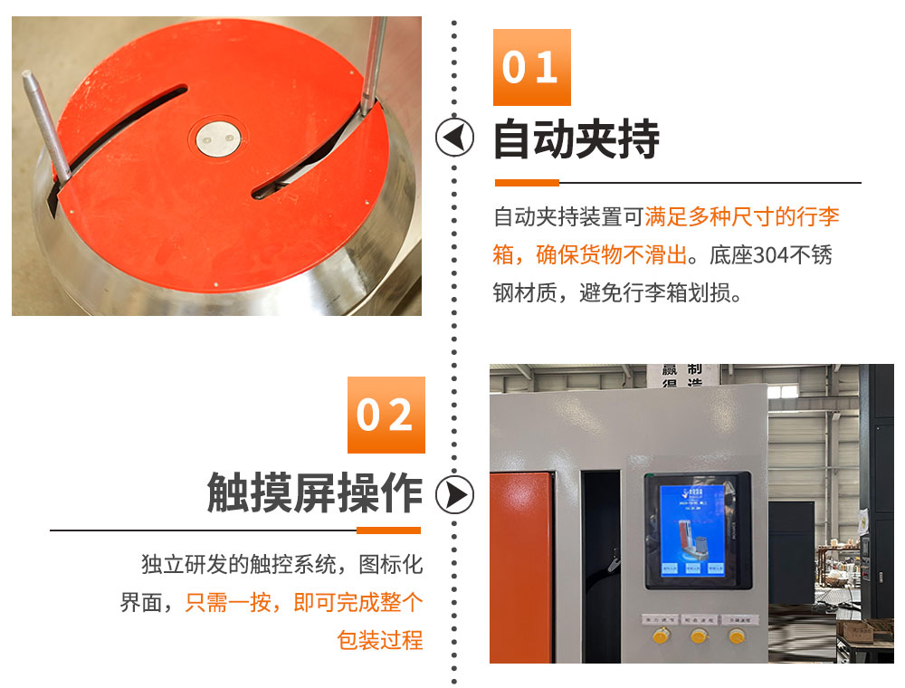 然後操作人員按操作麵板上(shàng)的啟動按(àn)鈕(niǔ),設(shè)備自動進行包裝,一般行李包3—5層即可!包裝完畢後,操作人員手工切斷薄膜,然後(hòu)取走行李!