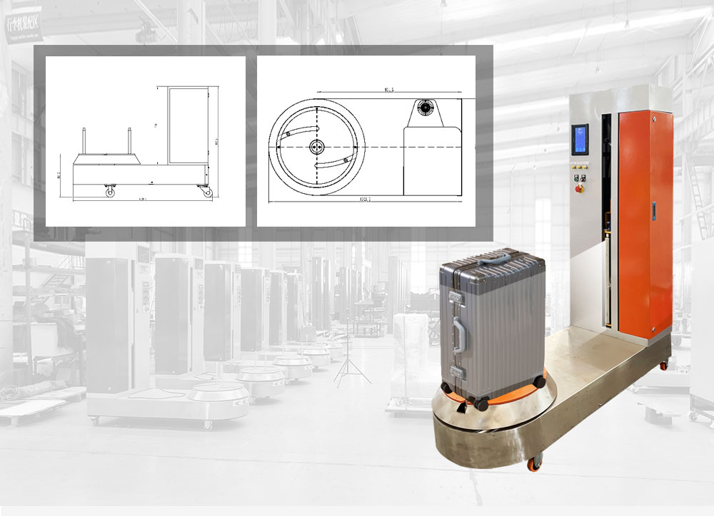 設備可以移動,操作人員將行李放到轉台上,並根(gēn)據行李(lǐ)的大小來調節垂直杆,從而使行李可以平穩的放在轉台上。