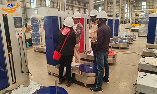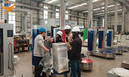 2024年6月23日,納米比亞客戶從廣州(zhōu)飛往(wǎng)濟南機(jī)場。抵達佳森工廠。Nick先生和Angela小姐(jiě)接待了客戶,陪同客戶一起去佳森工廠考察,對機場行(háng)李纏繞機很感(gǎn)興趣。