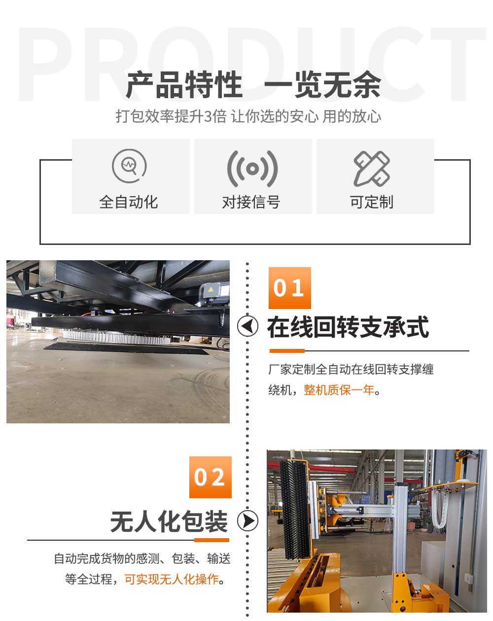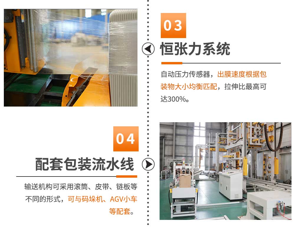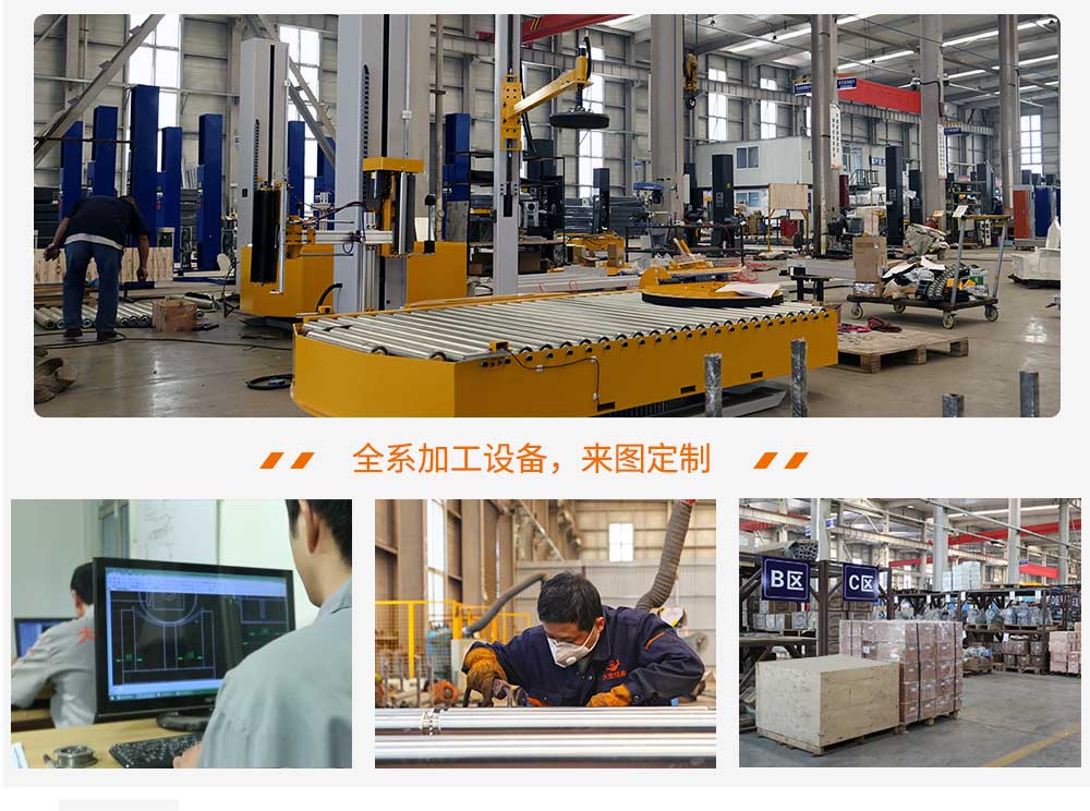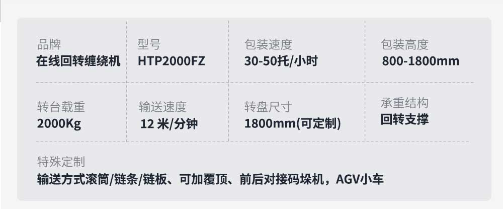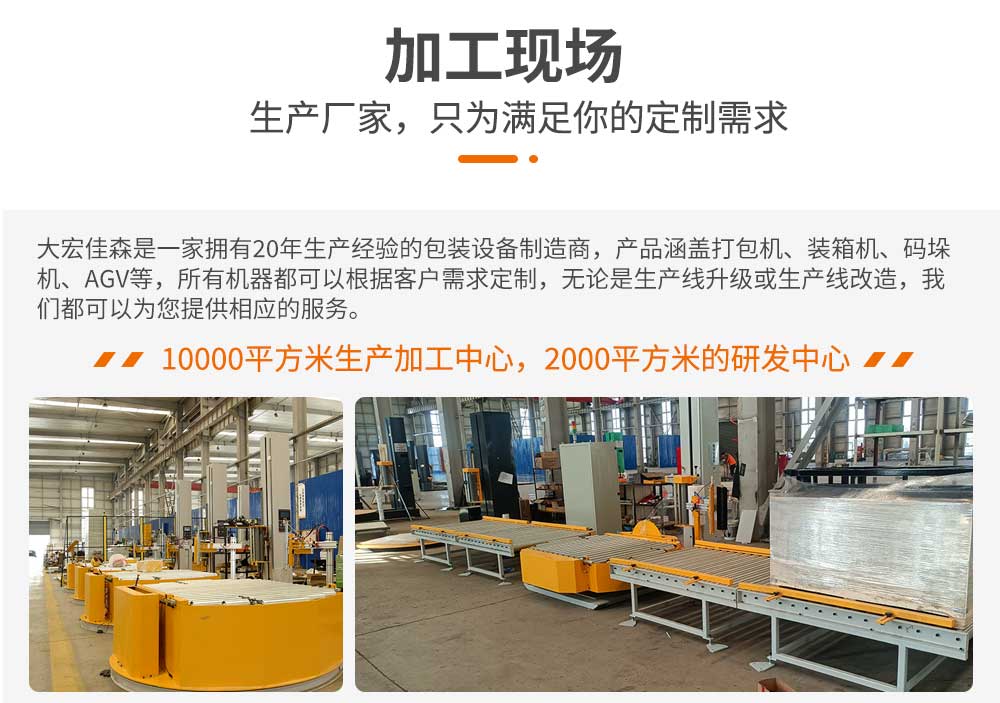 大宏佳森(sēn)在線回轉纏繞機HTP2000FZ,主要適用於生產量大、物流效率較(jiào)高的(de)現代化作業,滿足較輕或較重貨物的(de)包裝要求。